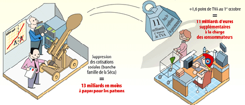 Pour l’union des syndicats FO, le transfert des cotisations « employeurs » vers la TVA « fera augmenter les prix et fera payer à l’ensemble de la population et en particulier aux salariés, aux chômeurs, aux retraités les exonérations accordées au patronat ». Il s’agit d’un véritable hold-up organisant un transfert massif de revenus au profit des entreprises, au détriment des salariés, des chômeurs, des retraités.