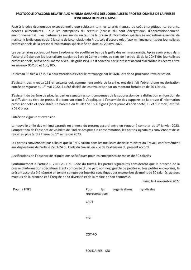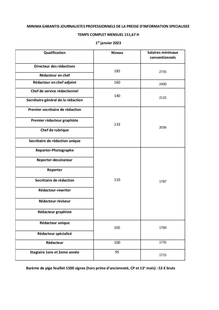 24/11/2022 Convention collective / Salaires Protocole d’accord relatif aux Minima garantis des journalistes professionnels de la Presse d’information spécialisée (au 1er janvier 2023) Publié par journalistesfo En savoir plus sur Journalistes FO Abonnez-vous pour recevoir les derniers articles par e-mail. Saisissez votre adresse e-mail… Abonnez-vous Partager : Partager sur WhatsApp(ouvre dans une nouvelle fenêtre) WhatsApp Partager sur Facebook(ouvre dans une nouvelle fenêtre) Facebook Partager sur X(ouvre dans une nouvelle fenêtre) X Partager sur Telegram(ouvre dans une nouvelle fenêtre) Telegram Partager sur LinkedIn(ouvre dans une nouvelle fenêtre) LinkedIn Imprimer(ouvre dans une nouvelle fenêtre) Imprimer Envoyer un lien par e-mail à un ami(ouvre dans une nouvelle fenêtre) E-mail J’aime chargement… Similaire