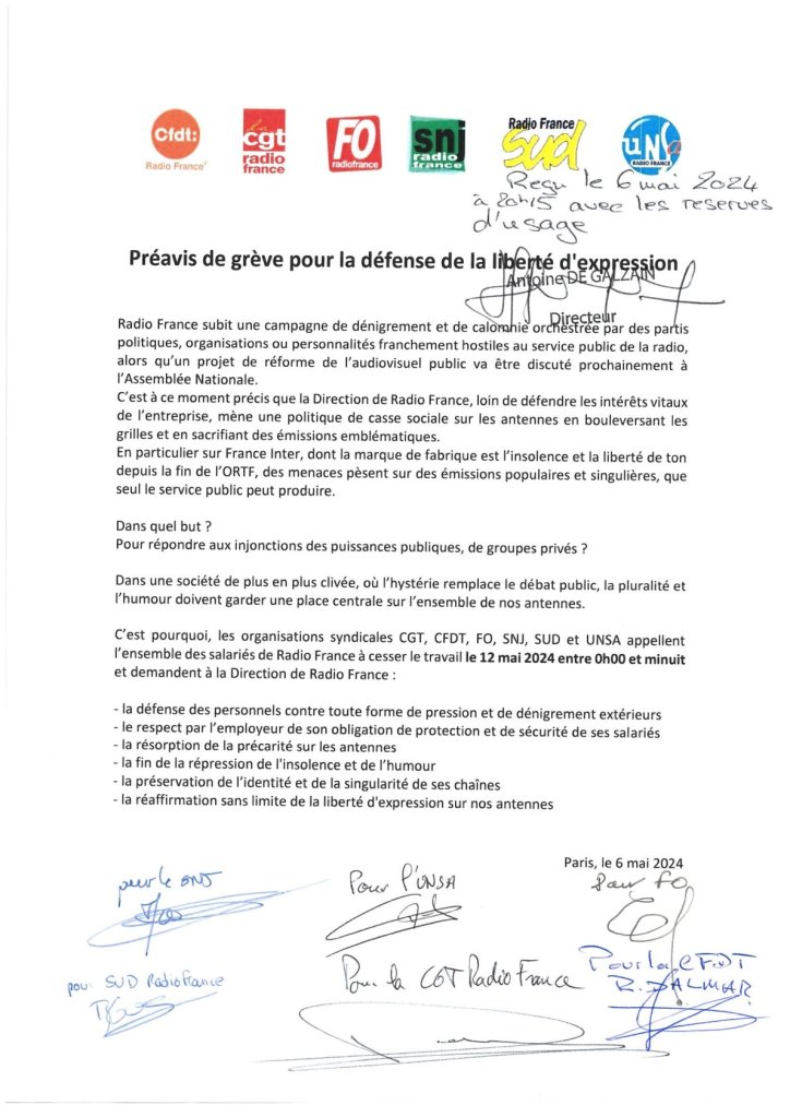 (…) Les organisations syndicales CGT, CFDT, FO, SNJ, SUD et UNSA appellent l’ensemble des salariés de Radio France à cesser le travail le 12 mai 2024 entre 0h00 et minuit et demandent à la Direction de Radio France :
